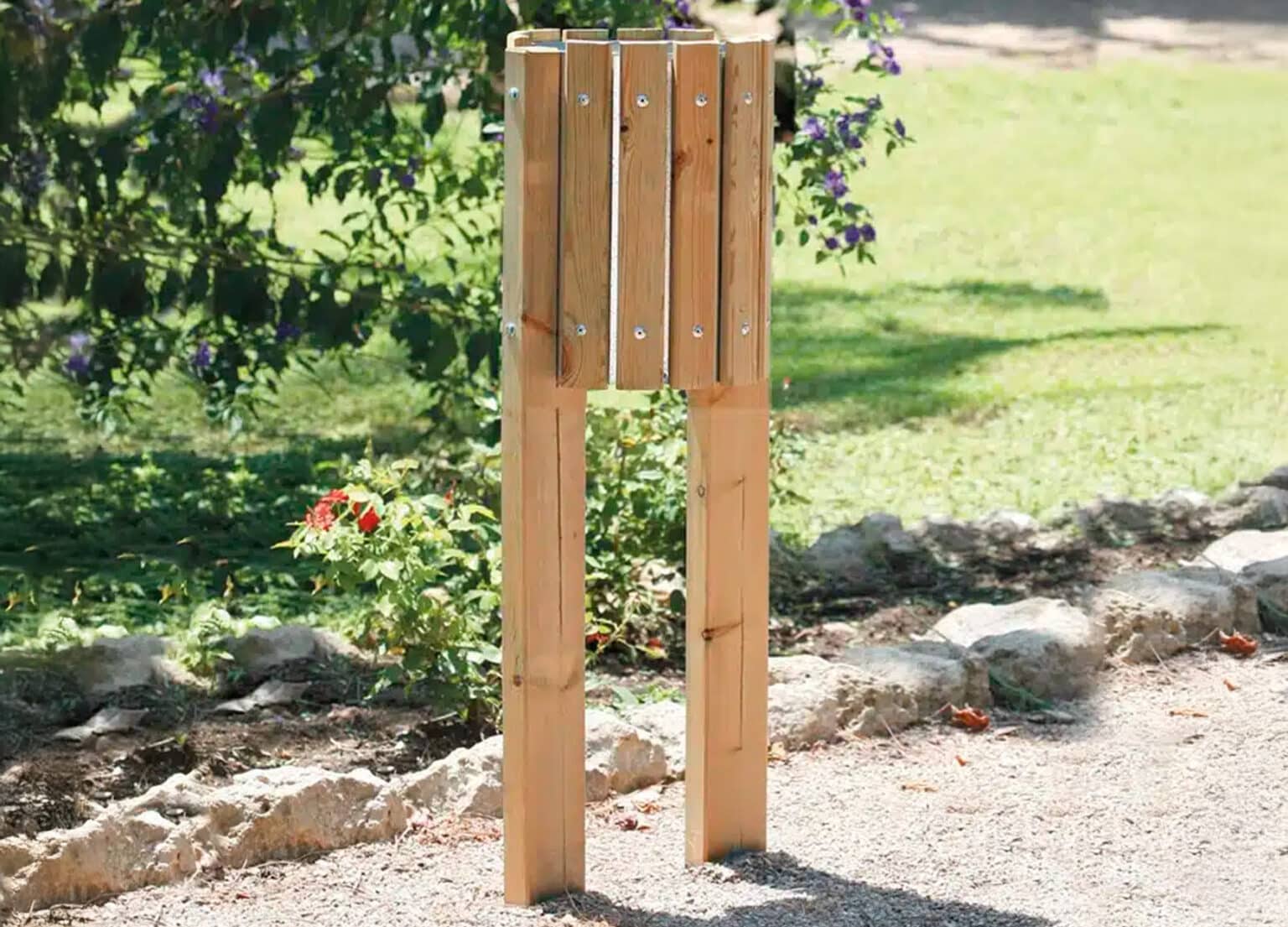 Cestino compatto rivestito in doghe di legno, ideale per spazi urbani.