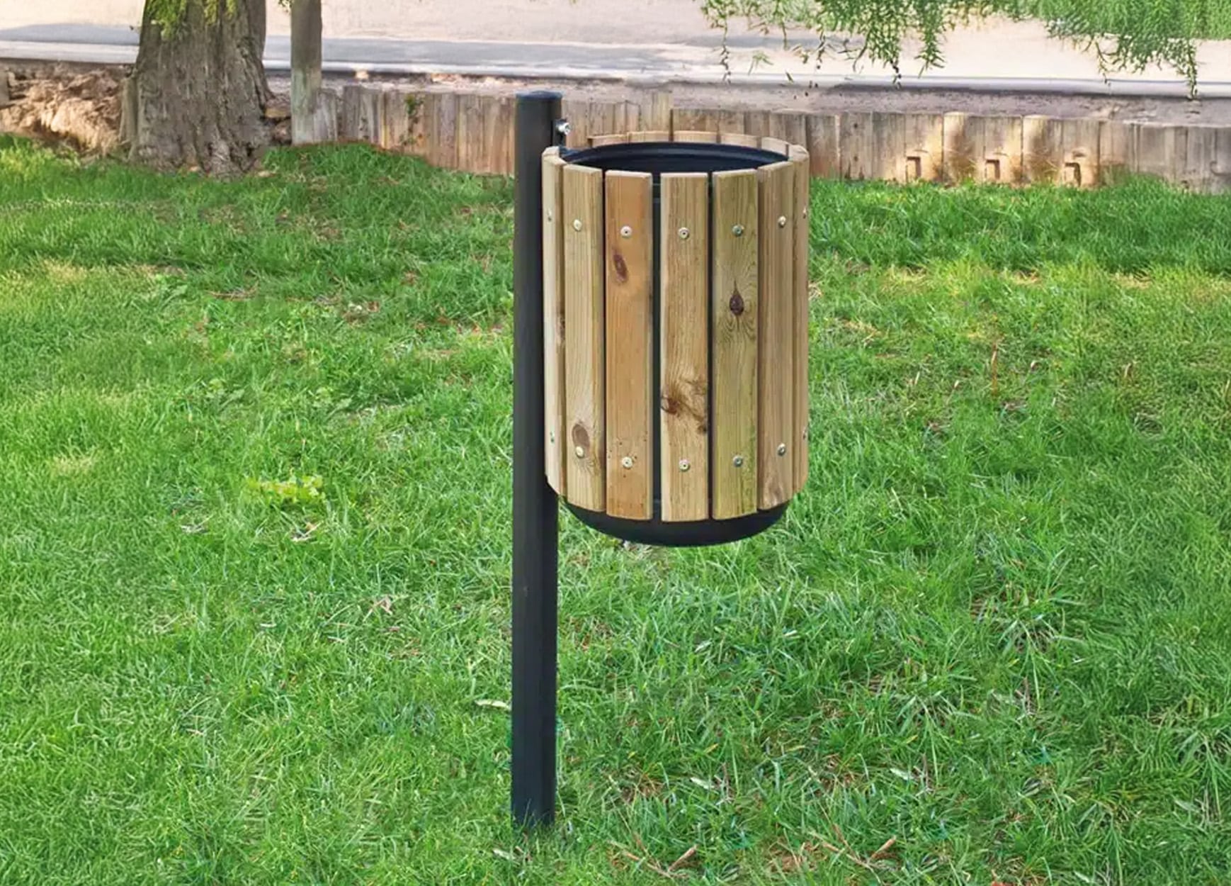 Cestino in metallo rivestito in legno senza coperchio, per arredo urbano.