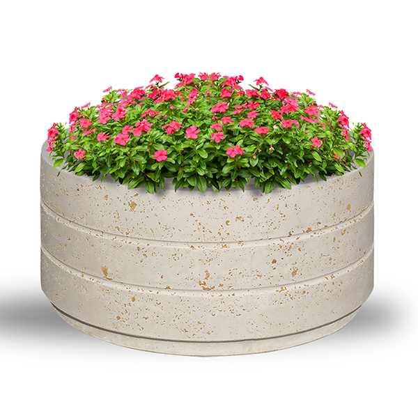 Caratterizzata da dimensioni generose, questa fioriera rettangolare è realizzata in cemento vibrato. Progettata per ospitare alberi o grandi arbusti, è perfetta per delimitare viali o creare zone d'ombra.