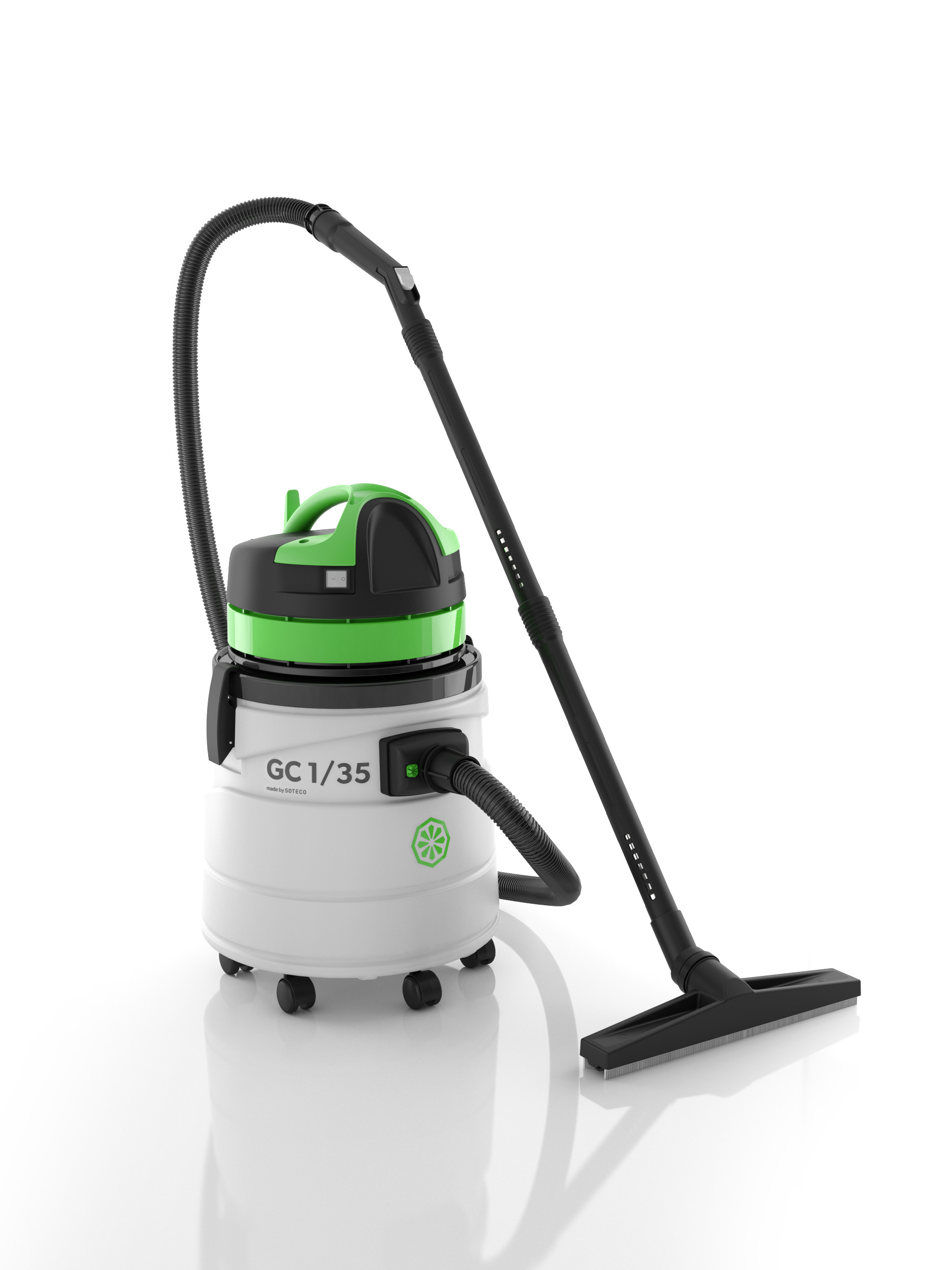 Aspirapolvere-aspiraliquidi dotato di motore performante, fusto da 35 litri in plastica polietilene altamente resistente ad urti e chimici. Catena accessori completa per pulizia in ambienti di medie dimensioni. Dotato di sistema antischiuma con galleggiante per blocco aspirazione meccanico a fusto pieno e filtro in poliestere per utilizzo Dry.