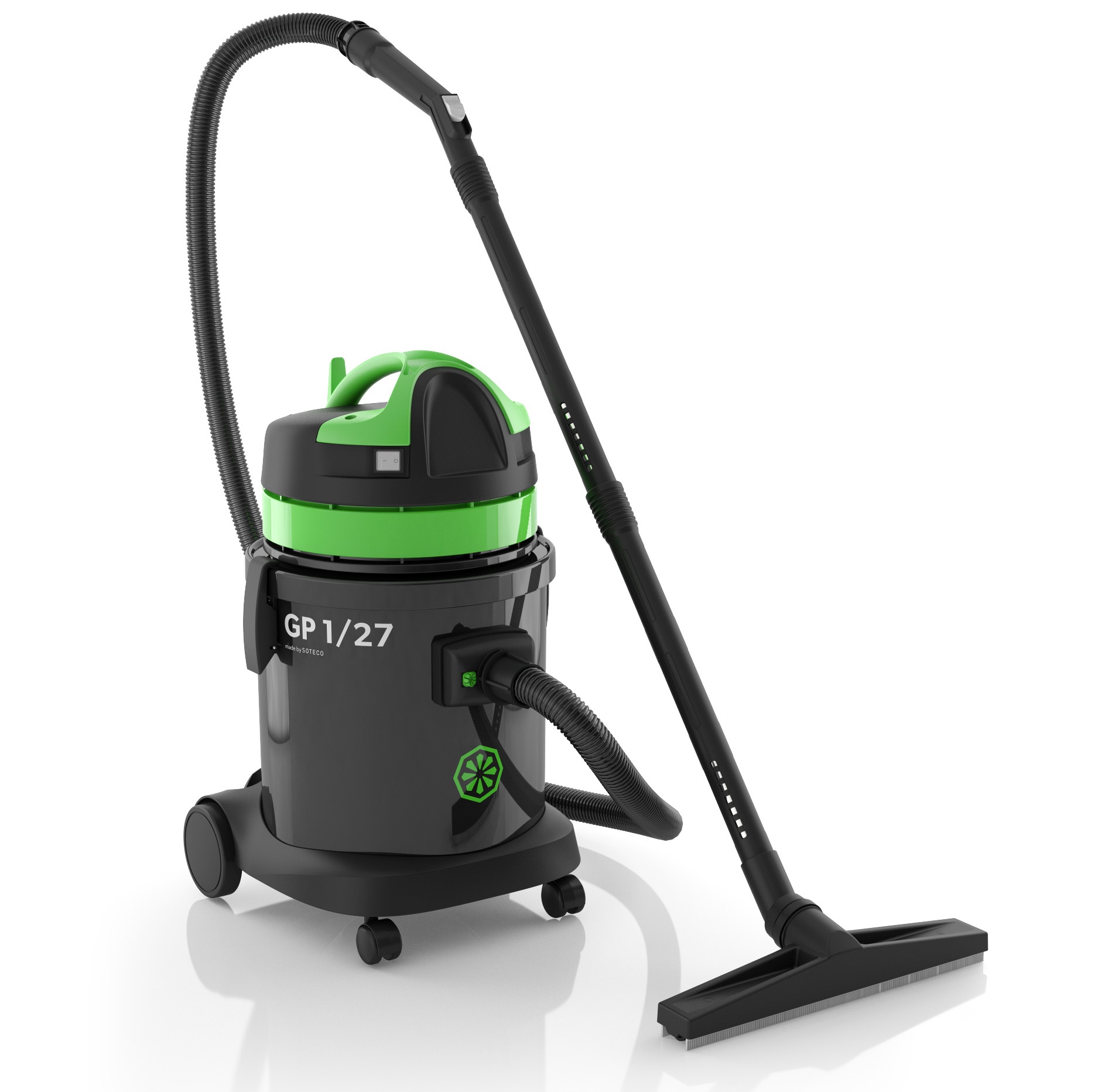 Aspirapolvere-aspiraliquidi dotato di motore performante, fusto da 27 litri in plastica. Carrello con 2 ruote posteriori fisse e 2 pivottanti anteriori con sedi per accessori e parcheggio spazzola. Catena accessori completa per pulizia in ambienti di medie dimensioni. Dotato di sistema antischiuma con galleggiante per blocco aspirazione meccanico a fusto pieno e filtro in poliestere per utilizzo Dry.