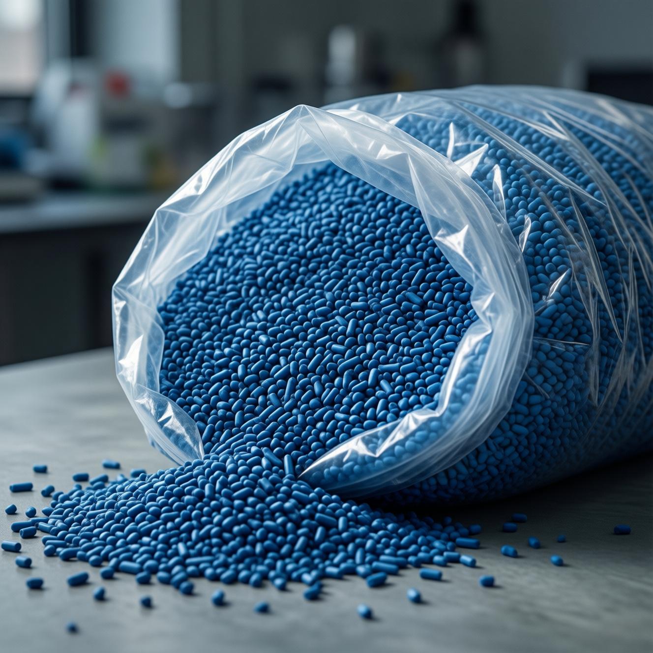 Granulo rigido in PVC riciclato (RMI95%) con pigmentazione blu, utilizzato per prodotti estrusi stampati per arredo urbano o industria. Alta stabilità dimensionale.