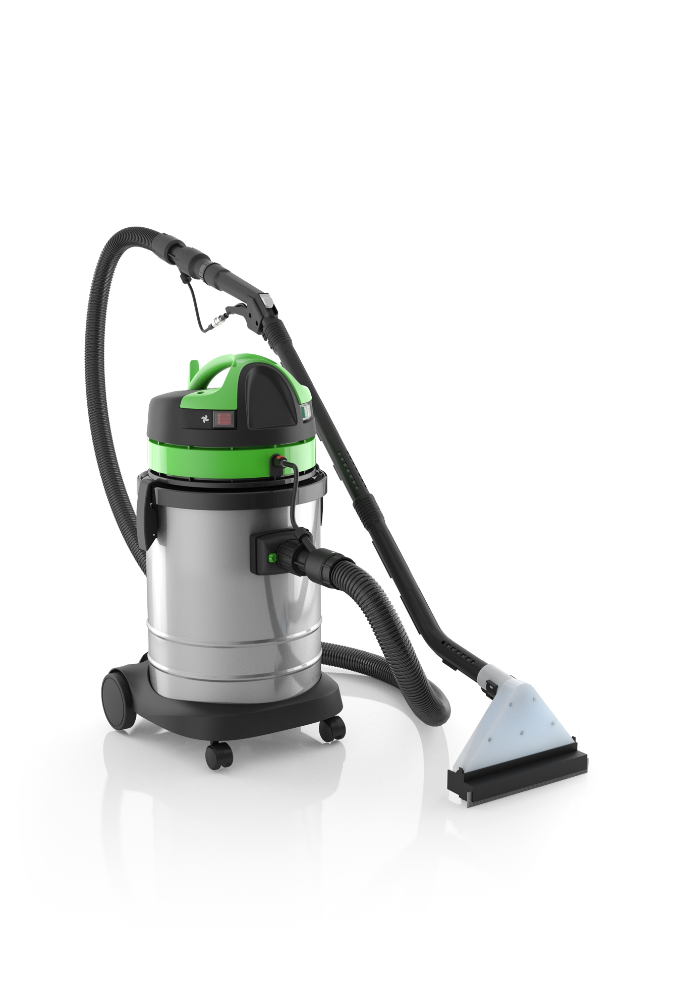 Aspiratore ad iniezione-estrazione con pompa integrata da 48W per pulizia imbottiti, moquette e tappezzeria. Fusto in acciaio da 33 litri con contenitore detergente interno. Accessoristica completa per aspirazione secco, liquidi e lavaggio.