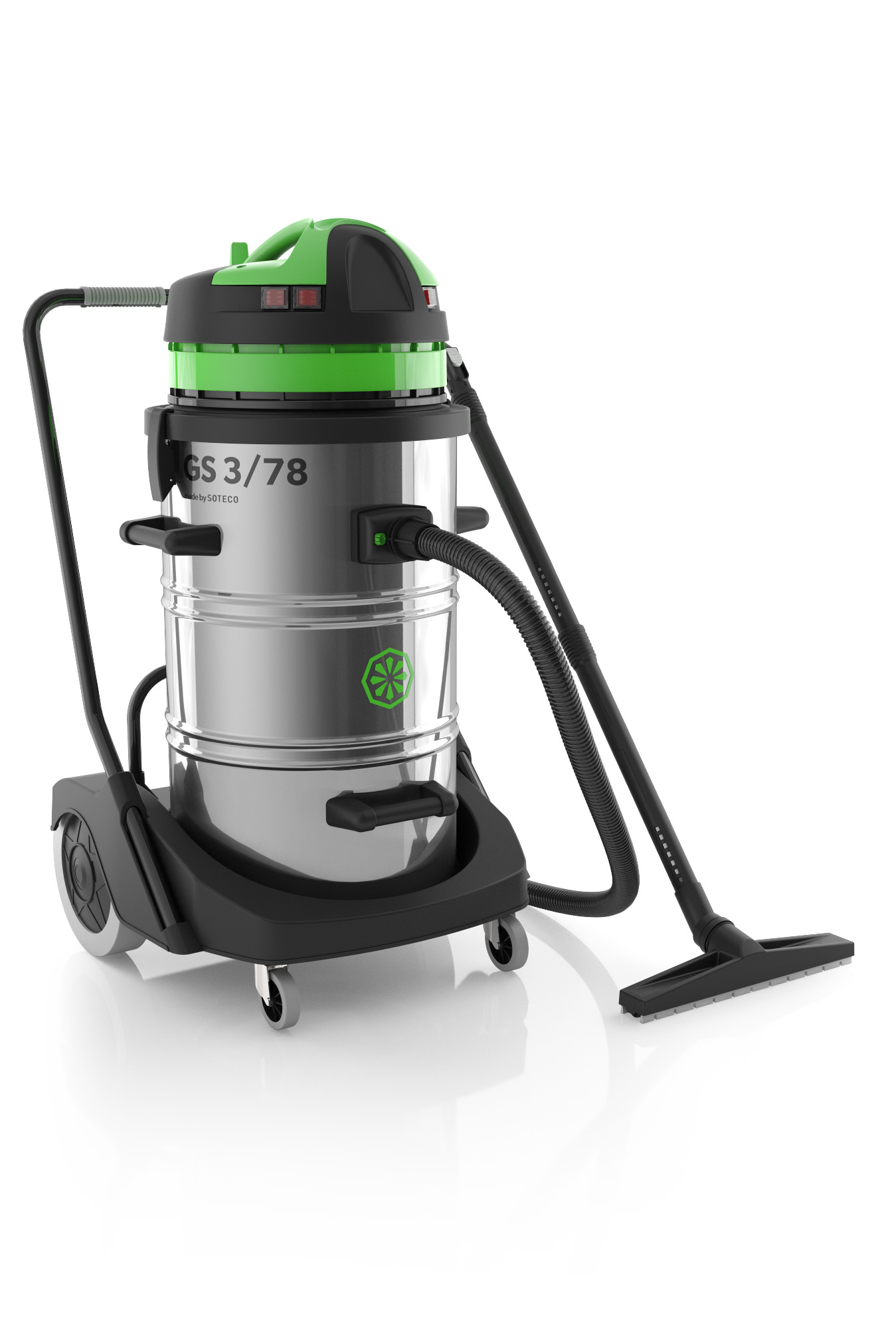 Aspiratore con serbatoio da 78 litri e tre motori, ideale per elevate quantità di polveri e liquidi. Con contenuto di polipropilene riciclato.