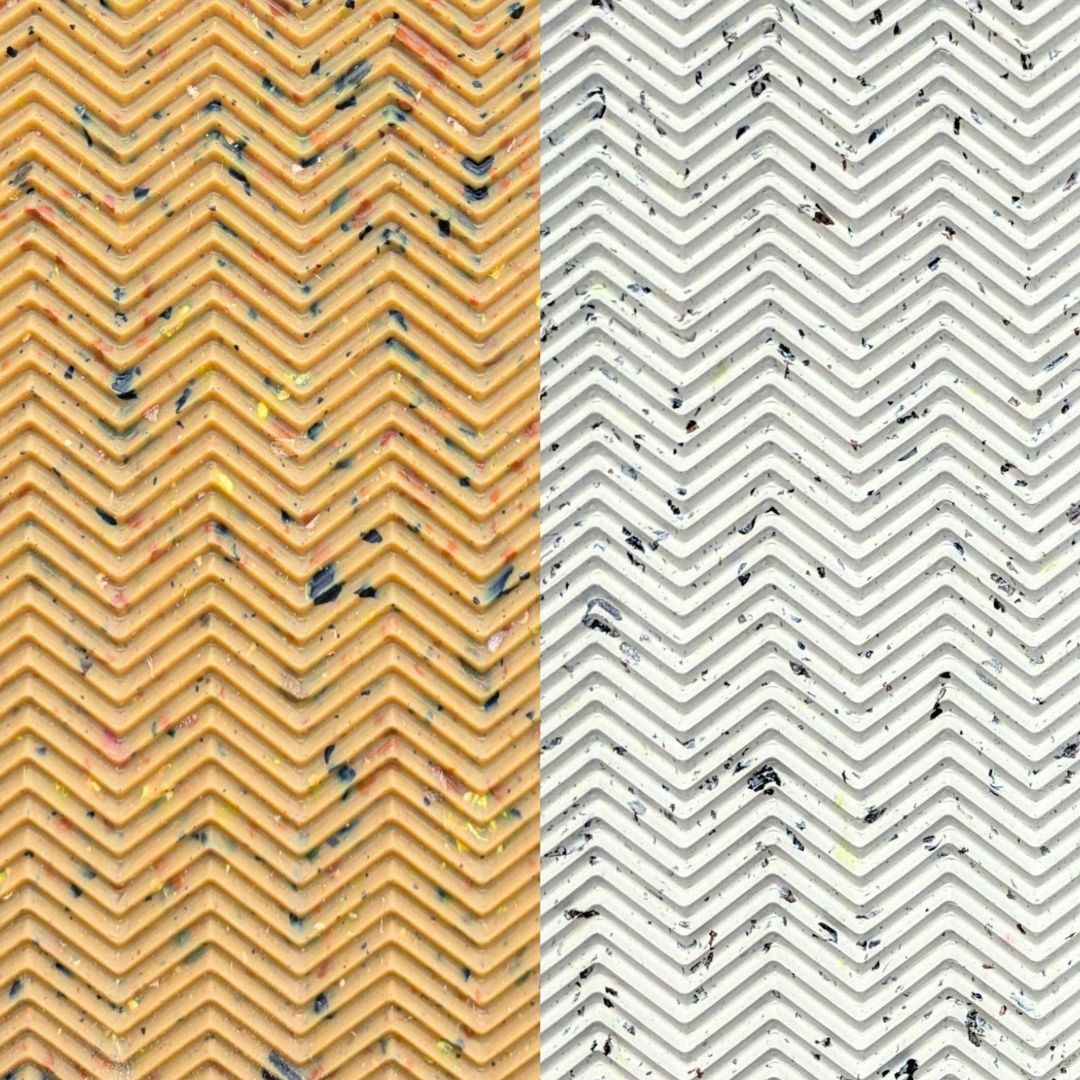 Lastre, tacchi, mezzesuole e spezzoni in gomma color miele, con il 14% di materiale riciclato.
