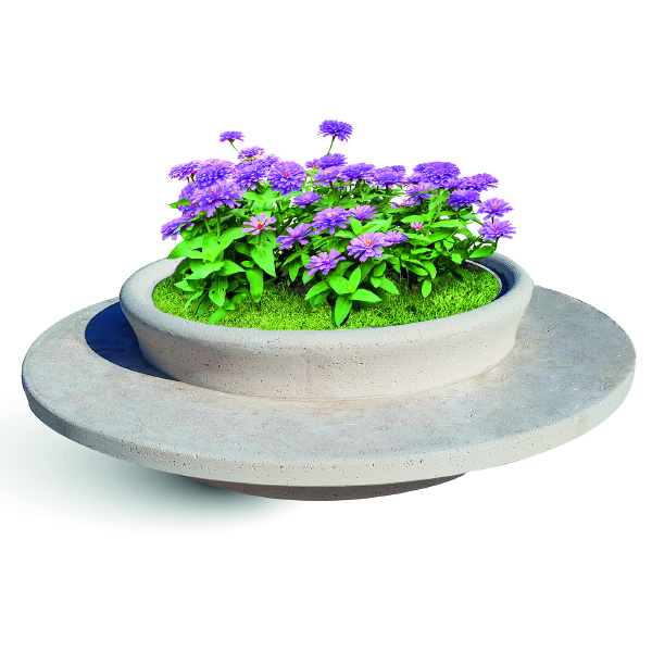 Panchina circolare in cemento con fioriera centrale. Calcestruzzo effetto travertino e armatura in acciaio.