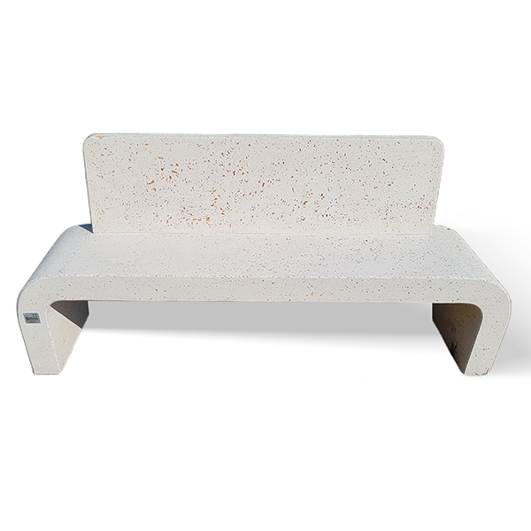 Panchina in cemento bianco effetto travertino con schienale integrato. Armatura in acciaio.