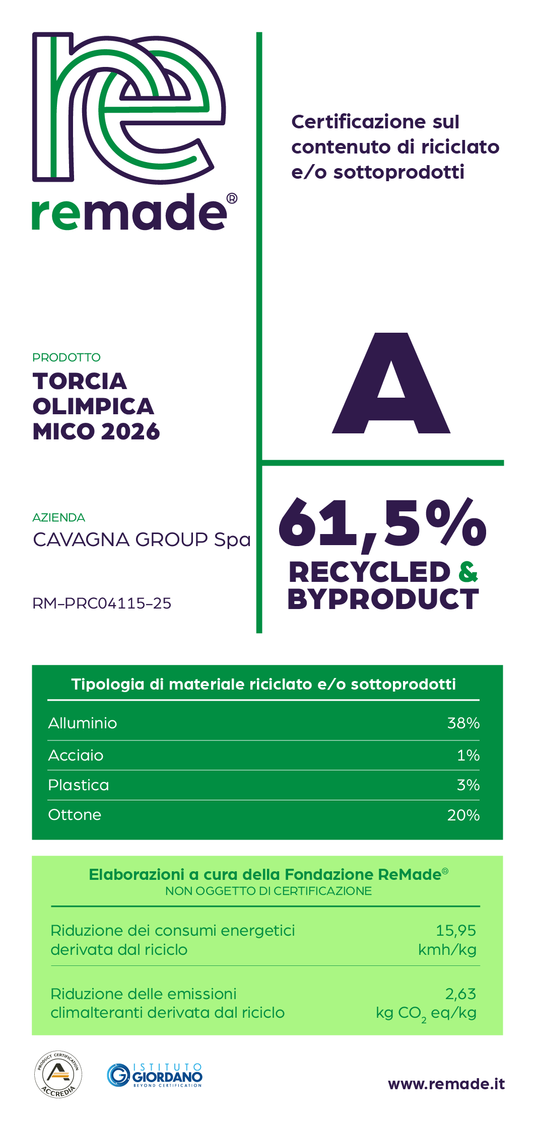 Torcia Olimpica multimateriale, I materiali riciclati utilizzati sono: leghe di alluminio con un contenuto di materia riciclata certificata pari al 90% (per le sezioni strutturali della torcia, quali la cover superiore e centrale, l’impugnatura e la torch cap), materiale plastico ultraleggero, polimero Xl Extralight , con percentuale di riciclato pari al 69%, acciaio black coil per il flame deflector, con il 21% di materiale riciclato e infine ottone per la valvola interna che raggiunge un contenuto di riciclato e sottoprodotto industriale certificato del 90%.