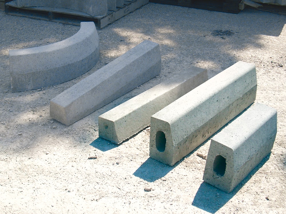 Perforated concrete curbs with openings that allow water drainage. Made with recycled cement and sand