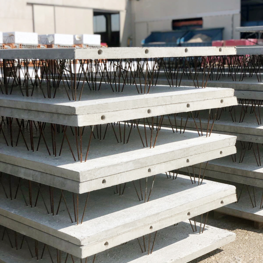 Precast reinforced concrete double slab consisting of two coupled panels designed to accommodate reinforcement and additional in-situ concrete casting.