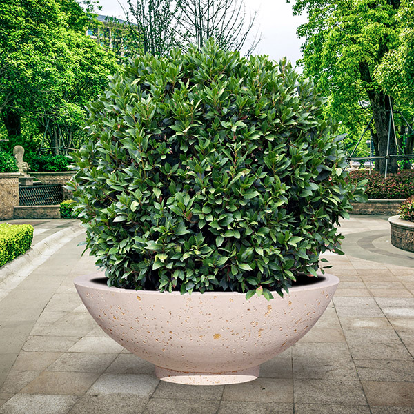 Large bowl-shaped planter made of reinforced concrete. Its capacity makes it suitable for trees or floral arrangements with strong visual impact